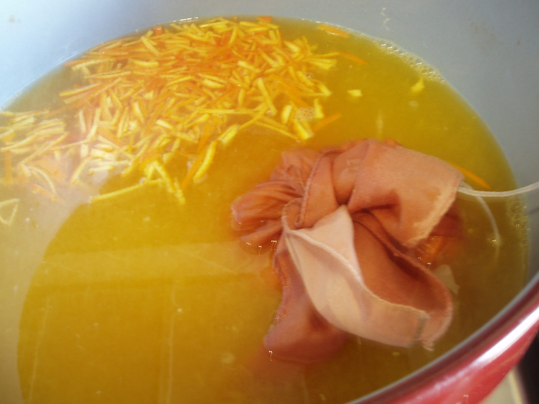Put the shreds of orange and your water in to the pot and bring to a simmer. You will leave this simmering for about 2 hours, pressing the cloth bag occasionally with a wooden spoon whilst enjoying the wonderful smell that fills your house.
