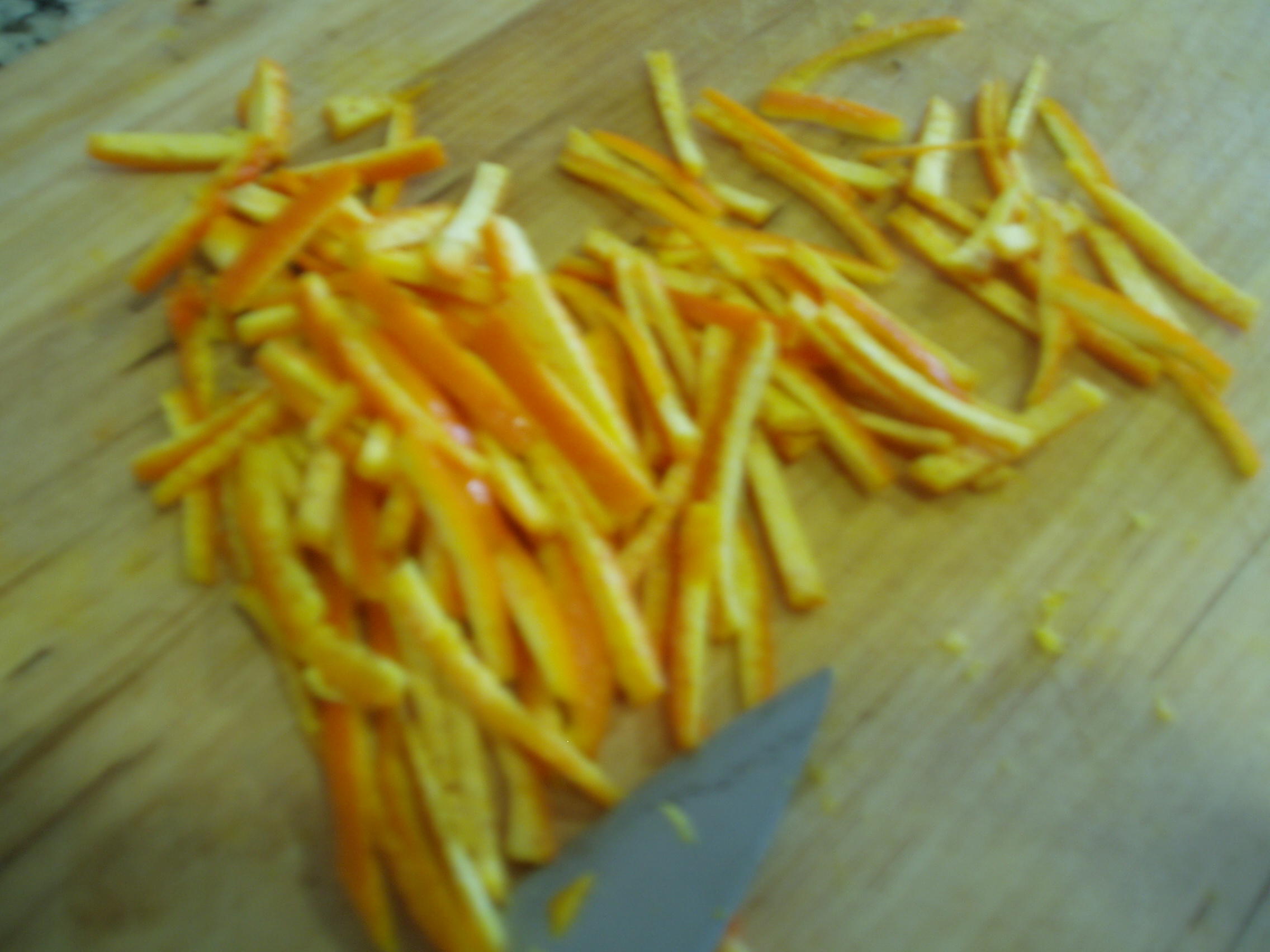 The orange skins now need to be cut into shreds. How thick or thin is down to you. One year I did this in the food processor, which leaves you with small chunks rather than shreds, but the taste was still wonderful. This year I patiently sliced, and sliced…and then sliced some more to end up with beautifully thin shreds of orange. You can relax a little now as the hardest part is over. You may find that getting to this stage takes you a few hours. Ignore cookery books that tell you it takes 45 minutes. All lies!