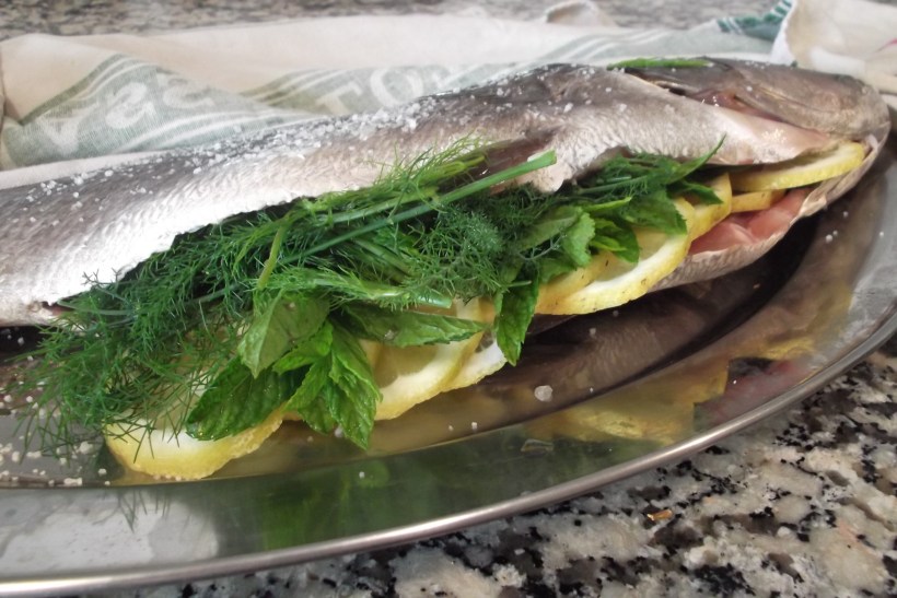 A few days later friends were coming over for lunch, and the sun promised to shine, so I decided to barbecue it. A quick visit to the garden to gather mint and lemons, and out into the olive grove for the tops of the wild fennel which is everywhere, and I was set.
