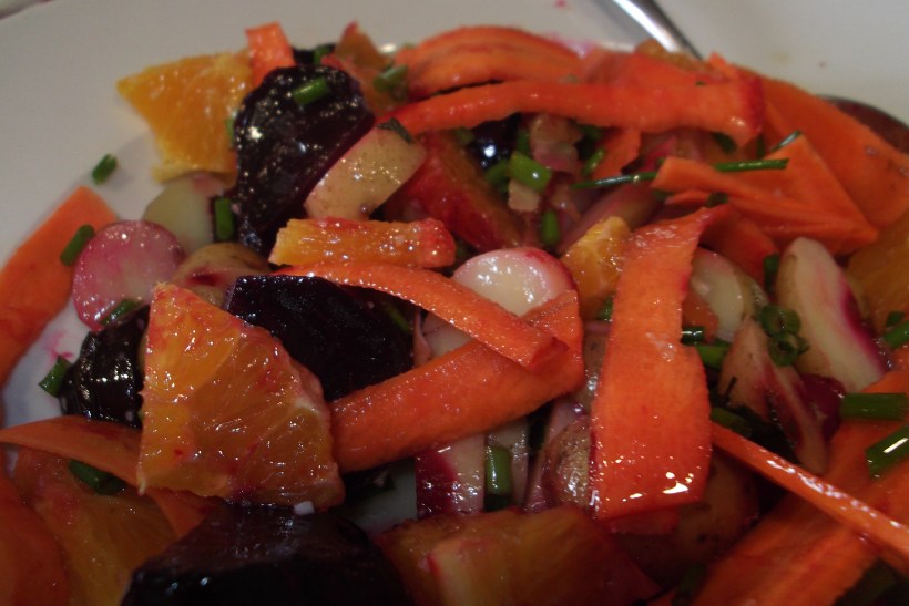 I served this with a delicious salad which was so beautifully coloured, it didn´t matter that the sun went in and a big cloud hovered over us all through lunch! I used chopped new boiled potatoes, cooked beetroot, oranges, thin slices of raw carrot and chopped chives. I made a simple dressing of olive oil, lemon juice, mustard powder, a clove of garlic, salt and pepper.