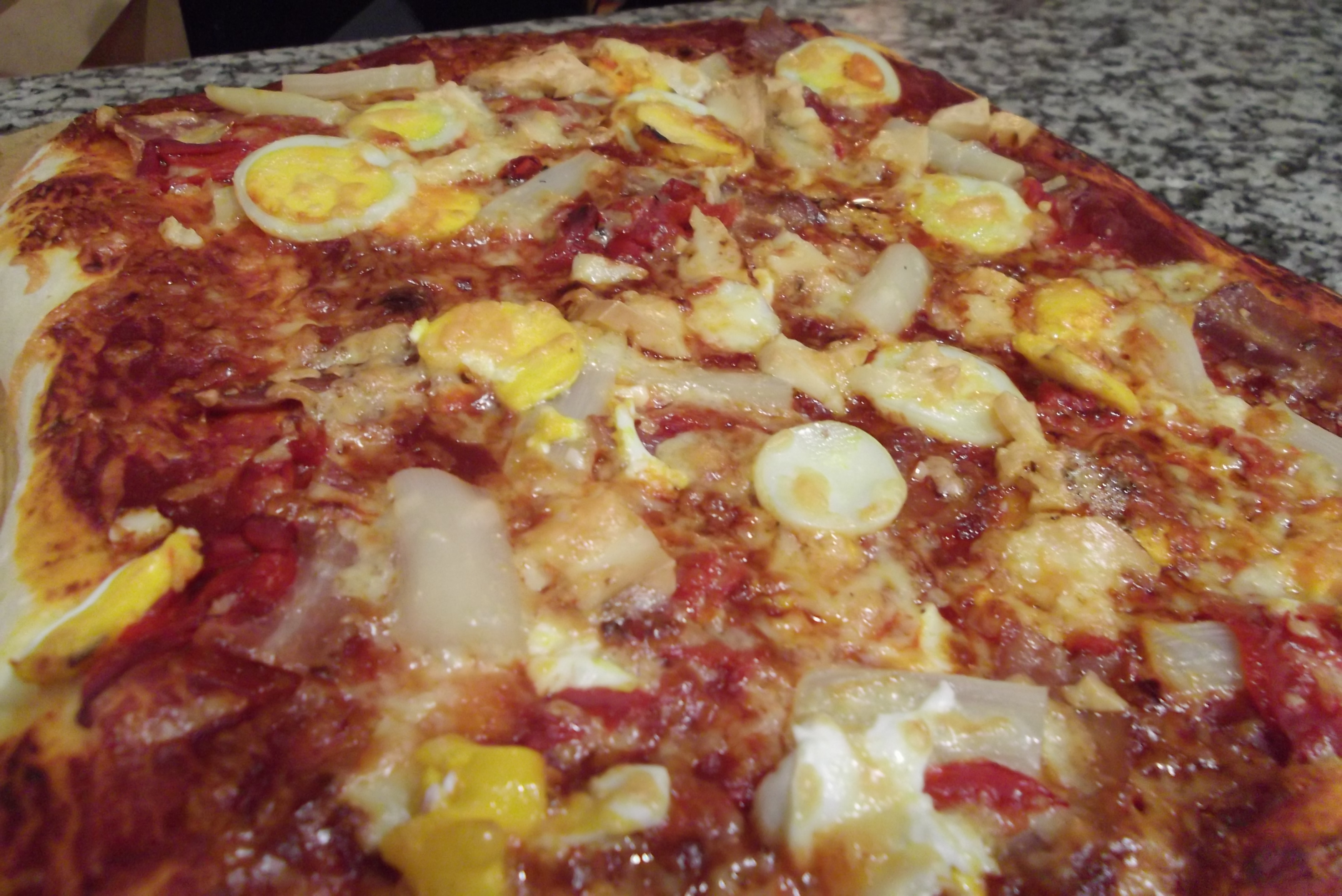 This weekend we had tomato sauce, white asparagus tips, hard boiled egg, bacon and crumbled mature goats cheese. Yes, not very “Plan Bikini” I know, but we were off to a fiesta and had a long night of dancing ahead of us to burn off the calories!