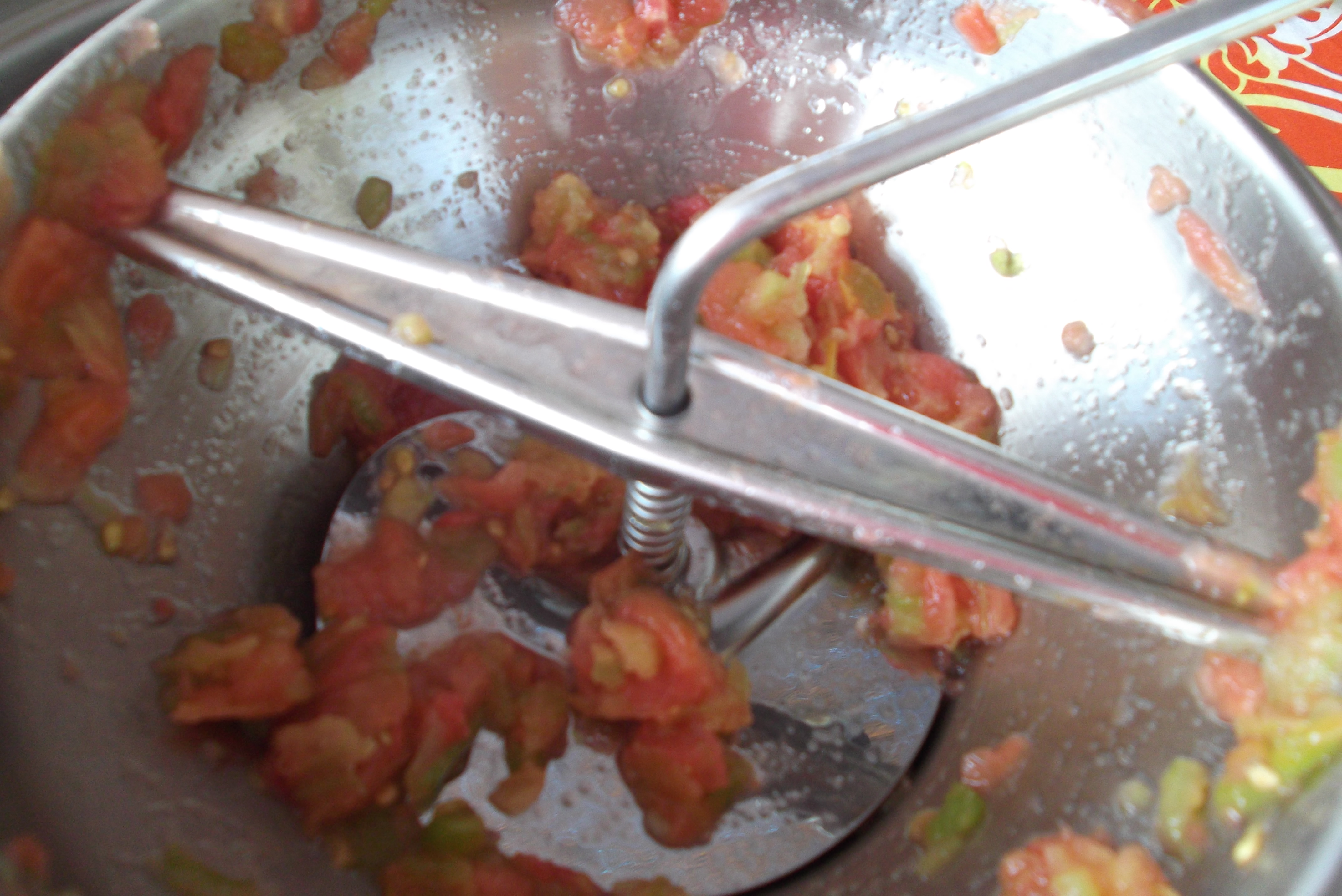 The mouli, if that´s the correct word in English, is a hand held vegetable mill and gets rid of any tough bits and seeds.