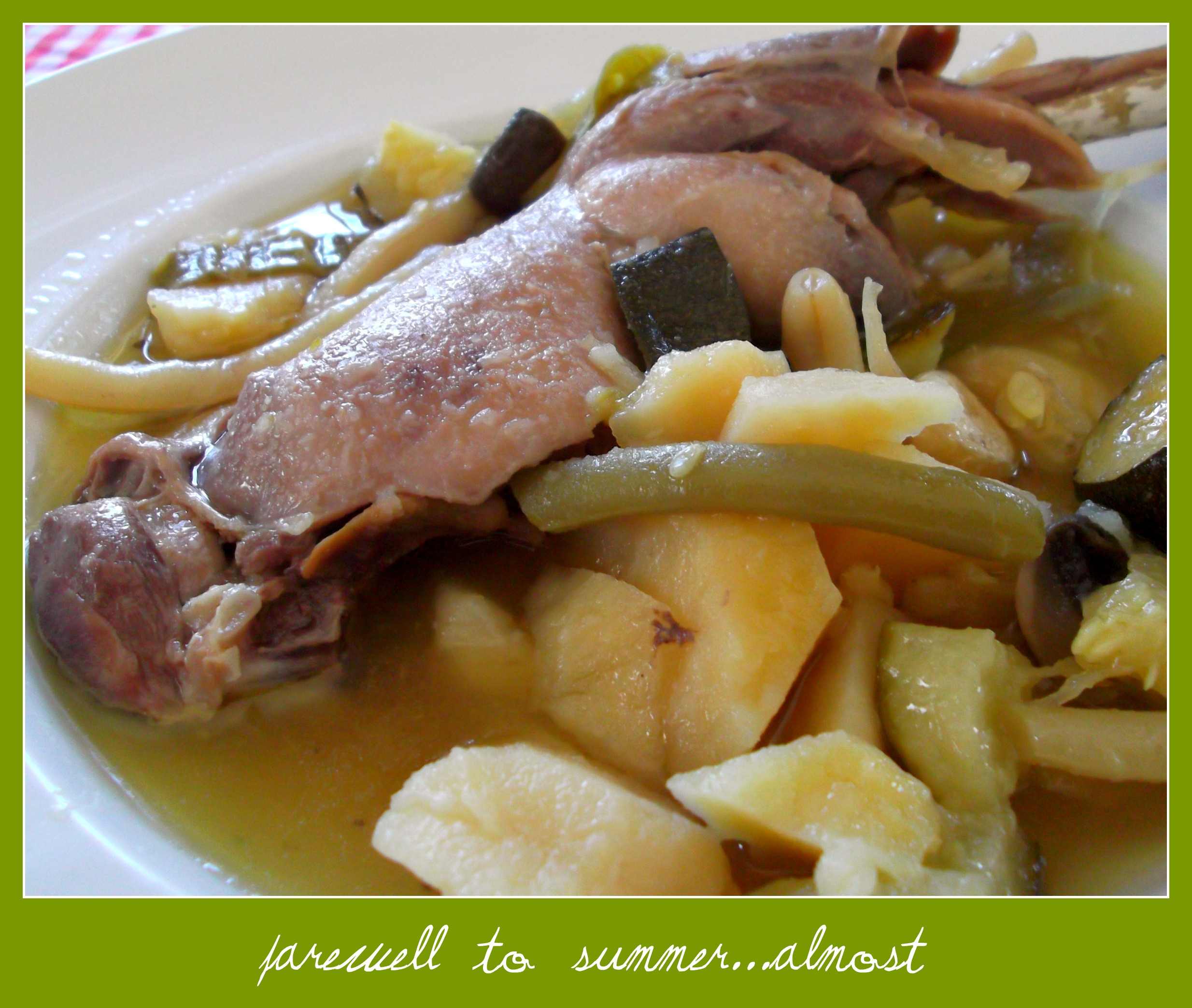 Into a big pot went two large legs (drumstick and thigh) of our free range chicken, some chopped peeled potatoes, large chunks of courgette given to us by a neighbour along with some whole unpeeled garlic cloves. A few chopped green peppers, a roughly chopped onion, a few handfuls of green beans and some seasoning finished off the ingredients. I covered everything with water and bought it to the boil then put a lid on the pot which then went into a very low oven for about 5 hours. You could, of course, cook it much more quickly on the stove top with equally good results if you´re not off out shopping for the morning!