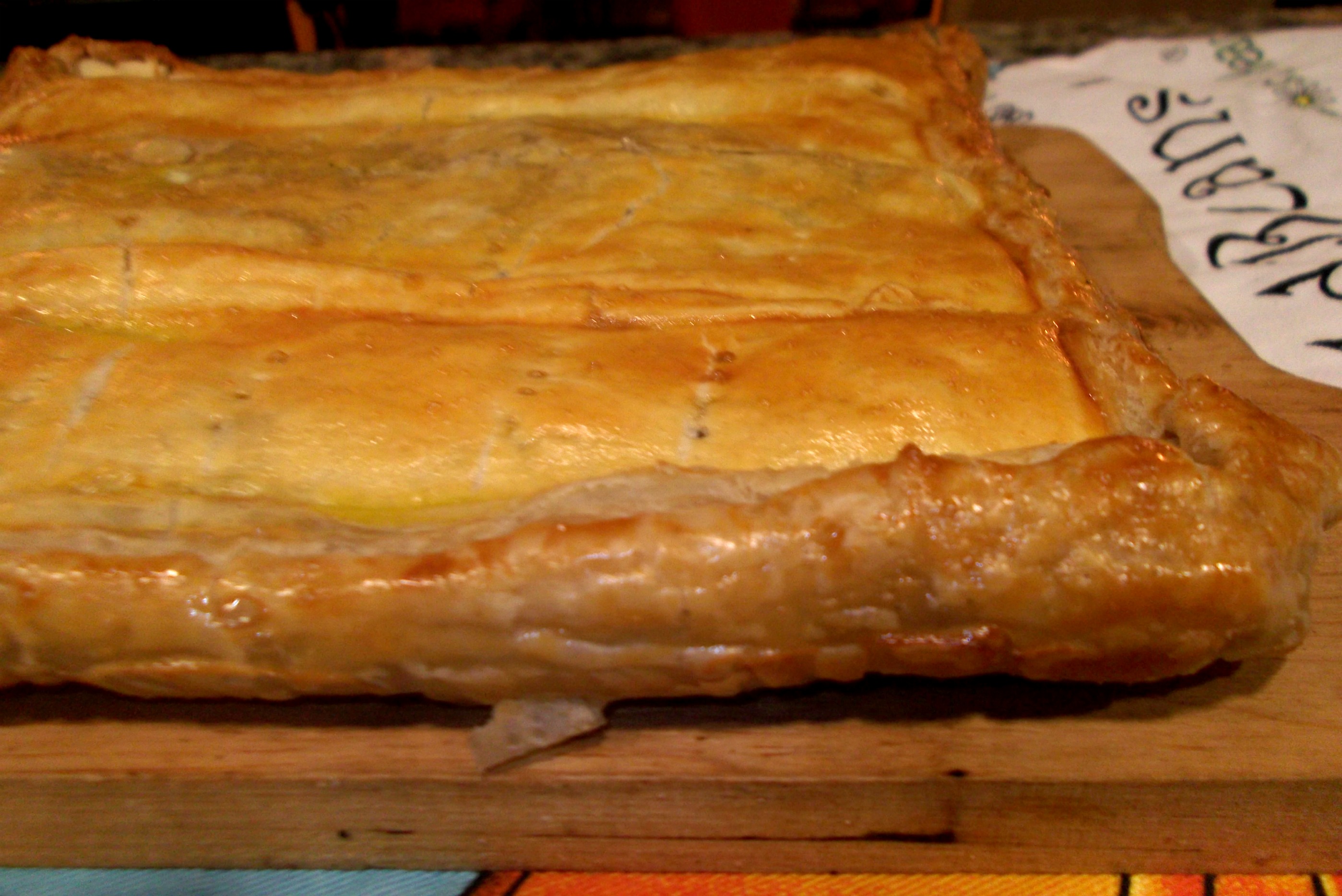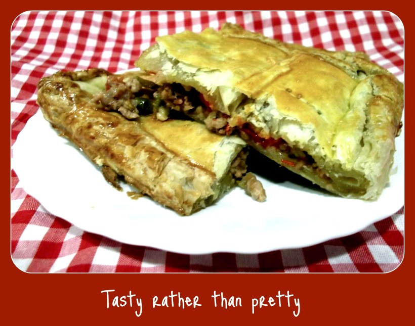 Inspired by some of the delicious Empanadas we ate on our recent trip, I decided I´d make a large one to see us through the DVD. Kitchen skills for this dish were fairly minimal relying on two sheets of defrosted puff pastry and a quarter of a kilo of minced pork. A traditional Empanada from Galicia is more typically made though with a light bread dough, so apologies for the shortcut.