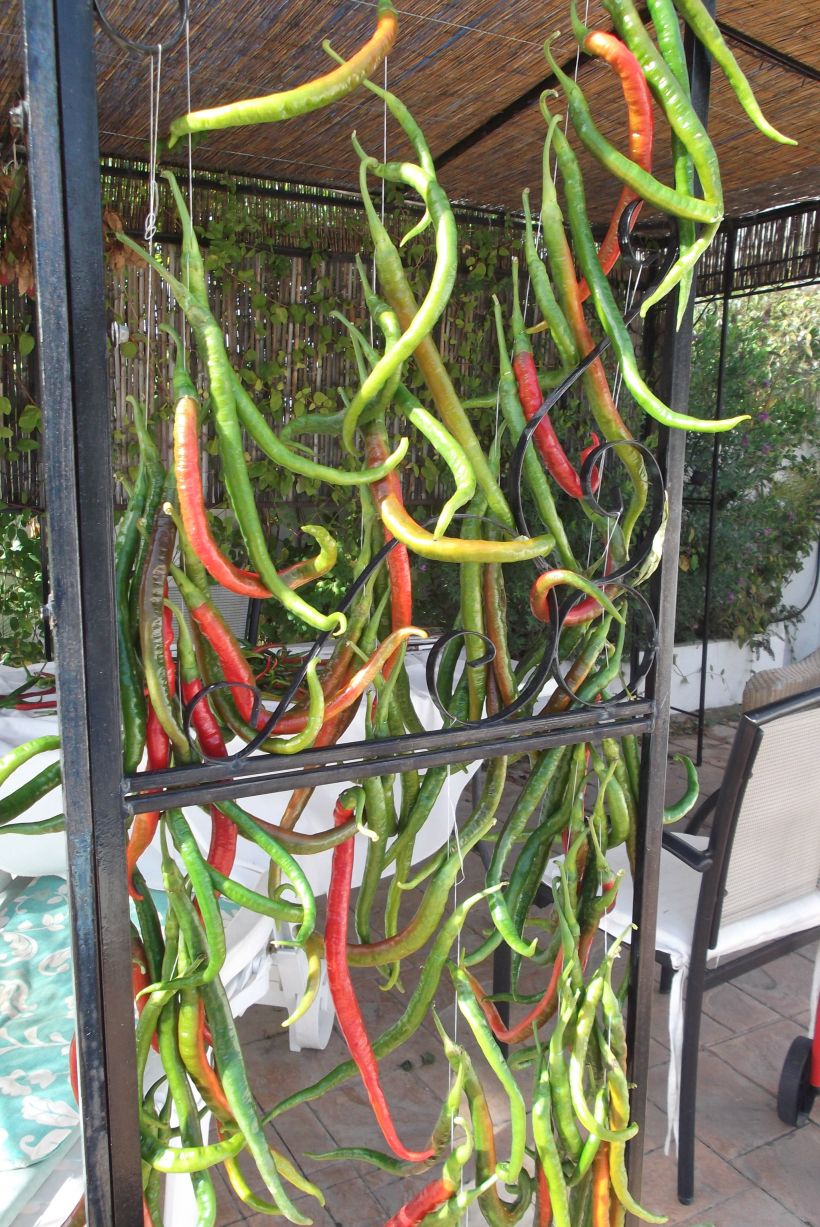 14. That’s one helluva chilli collection! I love the small red chillies. Very versatile. Do you know that in Kerala lots of fruit shops hang apples and bananas by the string like you’ve done in this post? Your garden is sunny beautiful and thriving…I want to get on the next plane visit Spain again!!