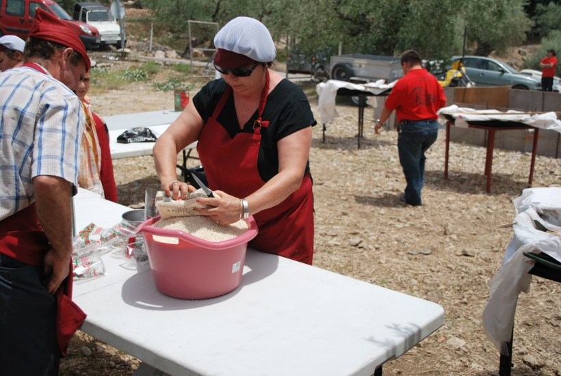 Open the bags of rice carefully – 14kg for 140 people, which translates to 100g per person at home.
