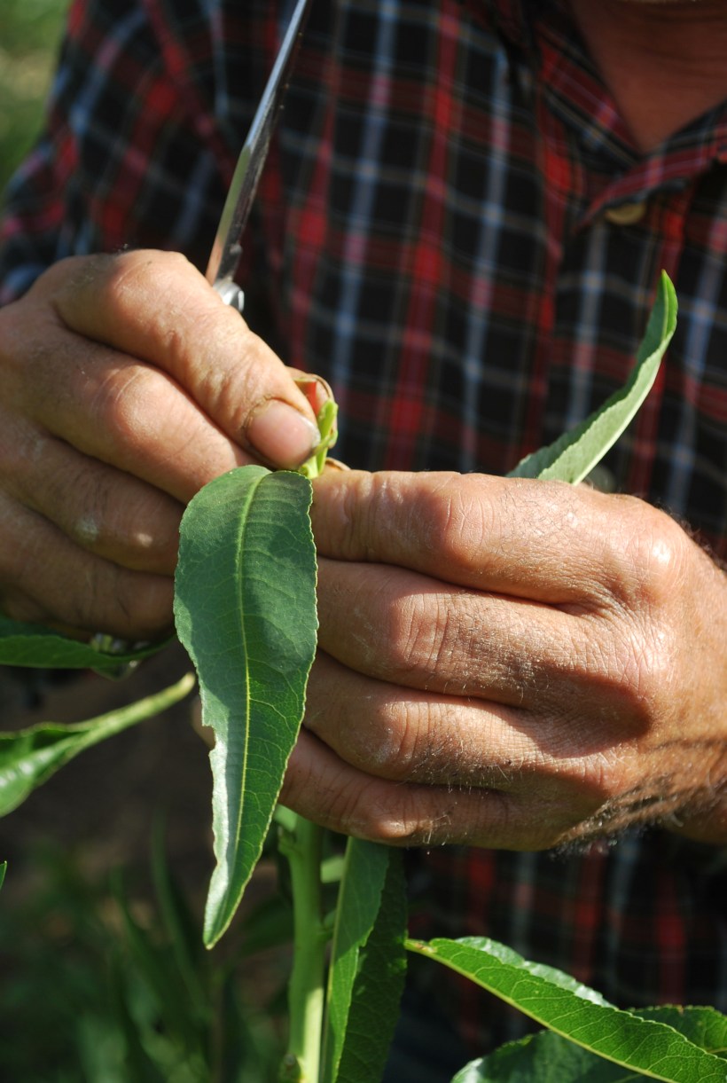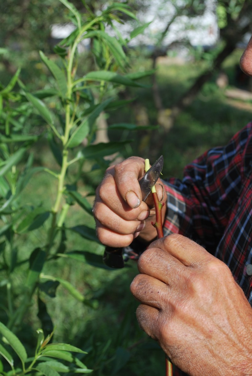 A tube (rather like a tiny section of a straw) is cut from the plant you will be grafting onto the host tree. It needs to include a little bud. Then it has to be slid off its own branch intact…tricky stuff.