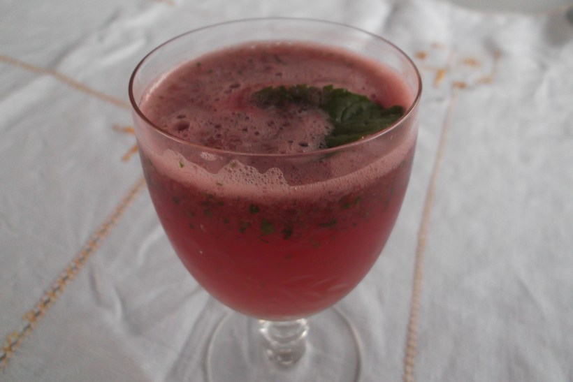 To make this drink I whizzed up (with my stick blender in a jug) about 6 large ices cubes made from the slightly cooked pitted cherries I had prepared a couple of weeks ago for Cherry Jam with a large chunk of sweet watermelon (about a quarter of a small one) and a few leaves of mint.