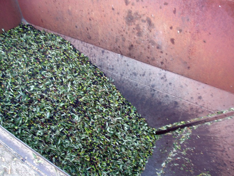 Some people like to pick their olives very early, when they are still smaller and green. This will give a lower yield of olive oil but of a very high quality. Think of those amazing tasting and expensive olive oils you can find in specialist shops. It’s wonderful for eating “raw” – which means in salads or as a dip – but not suitable really for cooking with. It can be hard to find a mill open to deal with the olives so early on on the season, at least it is where we live.