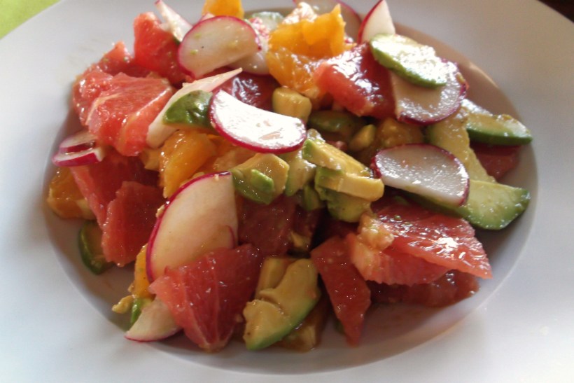 Dressing: any juices that run off the fruit as you peel them plus a teaspoon of lemon juice, the juice of an orange and twice the volume (of the citrus juices) of olive oil, a pinch of sugar if your orange is sour, half a teaspoon of mustard powder, a grind of pepper and a pinch of salt.