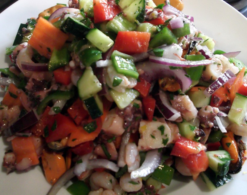 A typical tapas here which offers the best from the sea and the best from the salad garden is a Salpicón de Mariscos. We also enjoy it as a light lunch or supper dish or a starter. Of course, there are many ways of making it, depending on what you have available. Avocado? Yes, put some in. Don´t like cucumber? Leave it out.