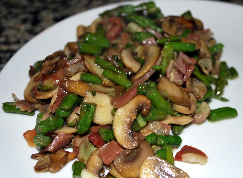 You will need 2 frying pans (or you will need to cook the potatoes and mushrooms separately. In one pan with about ½ cm of oil to cover the bottom, slowly cook the potatoes until they are soft and just starting to brown at the edges. Mix occasionally as they cook. You don’t want them to be crispy like chips.