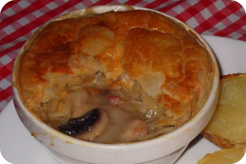 Put the mixture into a pie dish or small oven proof dishes if you want to do individual portions. Lay the puff pastry over the top, trim if necessary and cut a couple of small slits in the top to let the steam escape. Brush with the beaten egg and bake in a medium over (about 180º C) for about 25 mins or until the pastry is golden brown and risen.